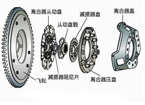 主動部分包括飛輪、離合器蓋、壓盤等機件組成。這部分與發動機曲軸連在一起。離合器蓋與飛輪靠螺栓連接,壓盤與離合器蓋之間是靠3-4個傳動片傳遞轉矩的。